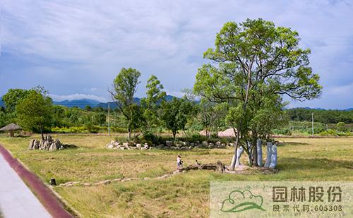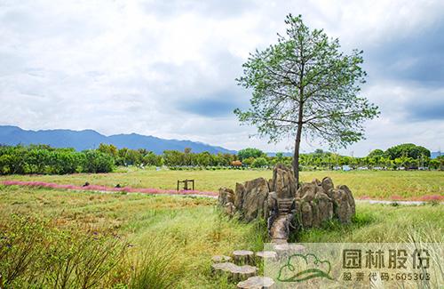 旁邊的一個樹島,用柴火和鋼管做出“鳥巢”形狀,雖稍顯“凌亂”,但卻顯得分外自然;再前方的一個樹島,增加“五指”塑石景觀,遠遠看去,好像一只大手托舉著大樹;穿過田間小路,來到幾棵大樹組成的樹林,錯落有致的景石形成一個自然的圍合空間,林間小路用舊木頭鋪成,道路兩邊用紫色鼠尾草、刀茅等植物巧妙搭配出清新的花境,坐在樹下的石頭上小憩,看著孩子們在追逐嬉戲,仿佛回到了兒時和小伙伴在村口大樹下游玩打鬧的時光,關于故鄉的回憶充盈在心間。
