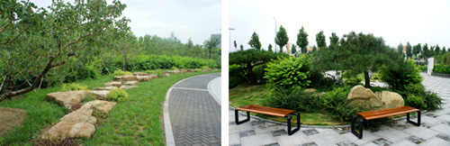 而在道路十字路口的節點處,則主要是用10cm×10cm的小花崗巖鋪地,鋪出來的路面整潔、平坦,看似簡單,實則對施工技術要求相當高。草坪中的地面鋪裝,則采用花崗巖汀步,用錯縫鋪裝法,兩塊花崗巖之間用草皮鑲嵌,就像給每塊花崗巖鑲了一道綠邊,與旁邊的草坪和諧地融為一體。貫穿整個工程的游憩步道,全部采用“人字形”的鋪裝方法,中間用透水磚、兩邊以花崗巖鑲邊,透水磚價格不高,用以鑲邊的花崗巖是利用了鋪裝中剩余的邊料,雖然用料簡單,但通過對技術的嚴格要求,鋪出的路面卻整潔而不失韻味,是一種實用、環保、節約的做法。