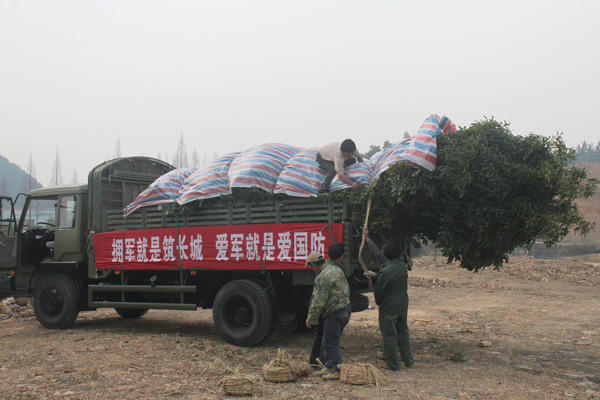 下午3點50分,八輛一字排開的軍車全部裝上了苗木,并進行了仔細的遮蓋和捆綁。隨后,在噼噼叭叭的鞭炮歡送聲中,車輛徐徐開出基地,向舟山方向駛去。