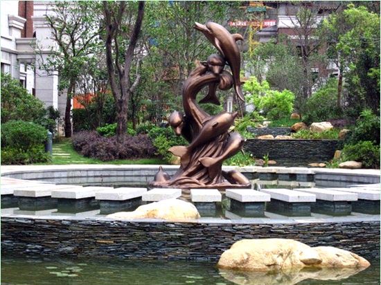 景觀小品是景觀中的點睛之筆,一些造型優(yōu)美的藝術(shù)小品,更是讓空間環(huán)境生動起來的關(guān)鍵因素。在保利·拉菲,帶有濃郁意大利氣息以及中西文化合璧的景觀小品隨處可見。入口處的歐式水景幕墻利用中國黑、黃銹石燒面、砂巖雕花巧妙結(jié)合,形成一幅精美的藝術(shù)畫面,幕墻中不斷噴涌的水流激起陣陣白色的漣漪,將后面寫有“保利·拉菲”字跡的景墻襯托得清爽大氣,在陽光照耀下,呈現(xiàn)出流暢、動感的畫面。特別引人注目的是模仿圓明園四大獸首制作的水景雕塑,牛首、豬首、猴首、虎首這四大獸首,形象上采取了西方動物的特征,融合了中國的傳統(tǒng)文化與西方的特色魅力,當(dāng)細(xì)長的水流從四大獸首的口中源源不斷地吐出、落入前方的水池里時,就與從下而上噴出的涌泉形成互動,一上一下、一細(xì)一粗,前方再配以色彩絢麗的花草,形成一處動靜相宜、格調(diào)清新的水景。