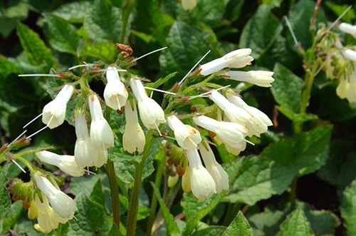 我是紫草科聚合草屬植物,叢生型多年生草本,作為高產飼料作物被世界各地廣為熟知,全株被向下稍弧曲的硬毛和短伏毛,聚傘花序,花序含多數花,花冠黃白色,花期3-5月,株高20-30cm。低矮緊湊可作為林下地被使用。還為低矮植物找不到發愁嗎?找我,找我,找我!
