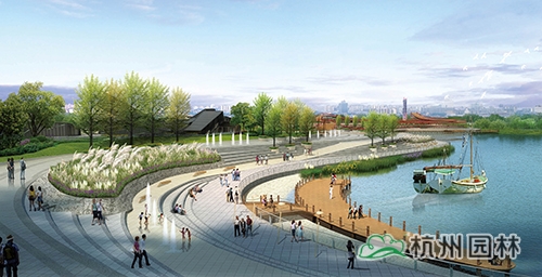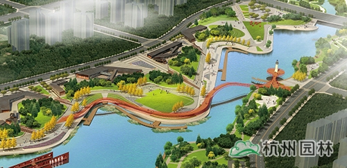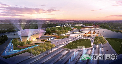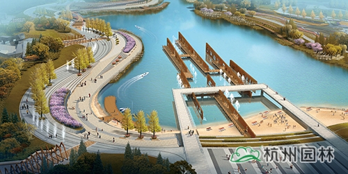 水岸廣場:臺地張弛有度,將臺階、坡道、草坪、木平臺、廣場組成豐富的濱水空間,流線型的岸線貫穿整個臺地,形成一條觀光濱水走廊,結合濱水岸線設置游船碼頭、親水平臺,形成極具特色的水岸廣場。