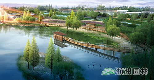 方案對原有坑塘進行綜合改造,由一系列下沉式綠地、景觀池塘形成雨水濕地,通過藝術化設計手法,大量運用開花地被與水生植物,形成迷人的雨水濕地,使其如同綠色海綿般,讓城市具有適應環境的彈性,保障城市生態安全。