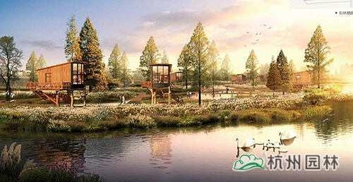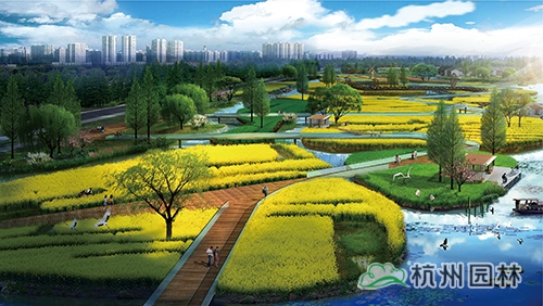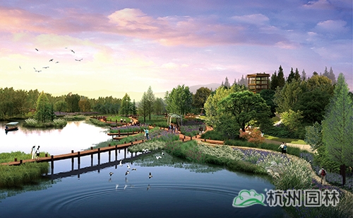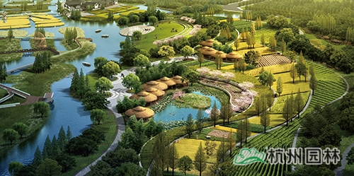 養生休閑主題區:對原有的生產景觀保留改造,水稻田、葡萄園、油菜園、果園、苗圃以及可食用水生植物被布置其中,兼具經濟與觀賞價值,結合水莊、竹庭、有機菜園,酒莊等休閑景點,推廣宣傳現代都市農業。