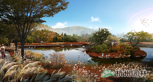 上湘湖突出濕地花卉的群體效果;中湘湖結合湖岸和島嶼片狀種植禾本高草類水生植物,形成十月蘆花飛揚的景象。