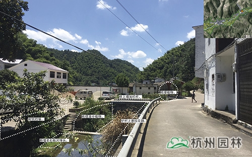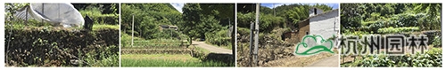 村莊整體綠化以山體綠化、田地種植為主。村莊主干道綠化情況不理想,主要為蔬菜種植和一年生草本花卉種植。村民庭院空間、宅前屋后綠量不足,影響村莊整體的綠化景觀風貌。道路邊上的裊溪水質優良,現狀平臺較為破舊,有些水潭節點缺少平臺。