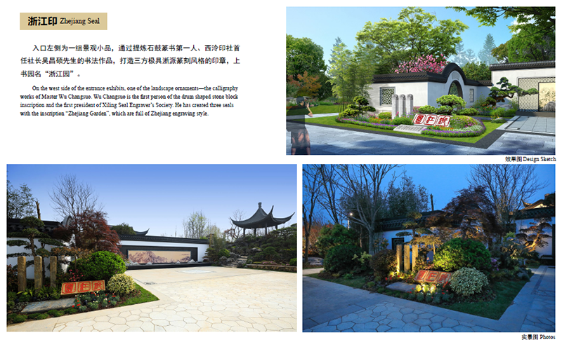 位于浙江園主入口西側(cè)的景觀小品“浙江印”,提煉自石鼓篆書第一人、西泠印社首任社長吳昌碩先生的書法作品,三方極具浙派篆刻風(fēng)格的印章上,“浙江園”三個字,干凈、利落,古樸、大氣。這幅美景的背后,是深化設(shè)計(jì)團(tuán)隊(duì)數(shù)次往返西泠印社,從無數(shù)的篆刻名家作品中挑選、比對,決定采用最能代表浙江篆刻藝術(shù)的吳昌碩先生字體,從中找出“浙”、“江”、“園”三個字,在設(shè)計(jì)圖中反復(fù)比對,調(diào)整位置、大小,最終確定下來。
