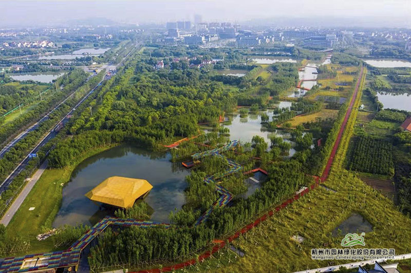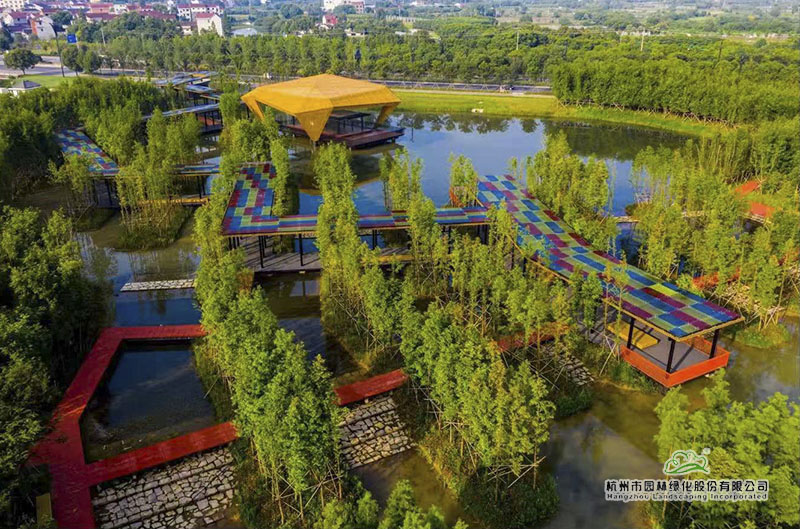 綠道建設(shè)充分融入海綿城市理念,從鋪裝材料的選擇到施工過程,均充分體現(xiàn)生態(tài)環(huán)保,與整個公園景觀和諧相融,集生態(tài)環(huán)保、觀賞游玩、休閑運(yùn)動為一體。沿綠道而行,蜿蜒交錯約2公里的空中廊橋,讓人體驗林中穿梭、空中漫步;‘鉆石切割、珍珠光澤’的珍珠涼亭,夜晚,在燈光的折射下,會散發(fā)出迷人的光澤,猶如一串閃耀奪目的珍珠,璀璨奪目。從高空俯瞰,紅色的綠道在碧水綠樹中穿行,將沿途景觀有機(jī)串連,形成一幅風(fēng)格鮮明的生態(tài)風(fēng)景畫卷。