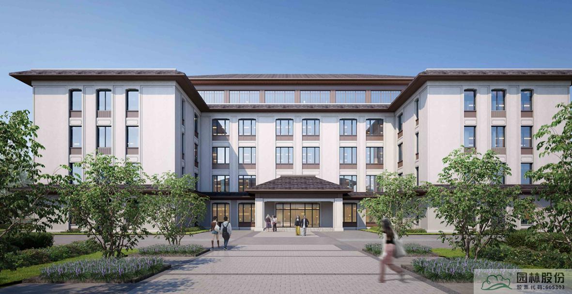 建筑風格以新中式為主,在與朔西湖大景區的風格相協調下,同時兼顧了使用功能。東西向的校園主軸線,從主入口廣場起,經整齊的樹陣、升旗臺、至綜合教學樓與綜合服務中心圍合的中心廣場,并向東延伸到宿舍區,是校園中最主要的視廊,大氣、莊重。
