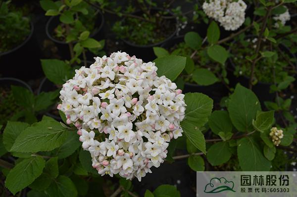 忍冬科莢蒾屬,落葉灌木,株高3-4.5 m,為瓊花和紅蕾莢蒾的雜交種。葉片較厚,較大,到秋季變成酒紅、橙紅或紫色色調。聚傘花序花蕾粉紅色,開放后白色,聚集似小雪球,具芳香,花徑8-14cm,花期3-4月。喜光,半陰環境也生長良好,生長速度中等;擇土不嚴,微酸性、中性至微堿性土壤均可生長,尤喜濕潤、排水良好的富含有機質土壤;抗寒性強;耐修剪,適合自然風格的工程應用或庭院觀賞。