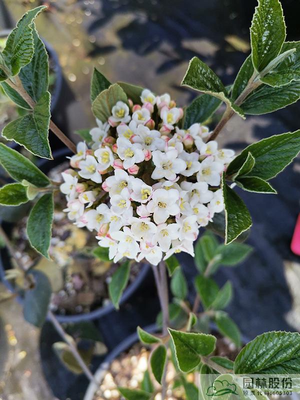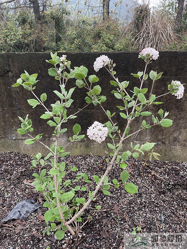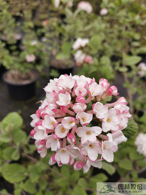 忍冬科莢蒾屬,半常綠或常綠灌木,株高2-3 m,為紅蕾莢蒾和煙管莢蒾的雜交種。葉色深綠,秋季轉紅,顏色程度因所處地區而異。該種繼承了紅蕾莢蒾粉花的優良基因,花序未開放時呈現靚麗的粉色,開放后白色,且具有較濃郁的花香。花徑一般4.5-10 cm,花期3-4月。植株具有良好的頂端優勢,枝條年生長量大,但分枝能力稍弱。幾乎無病蟲害。適應性強,生長速度快,耐干旱且耐寒,適合自然風格的工程應用或庭院觀賞。