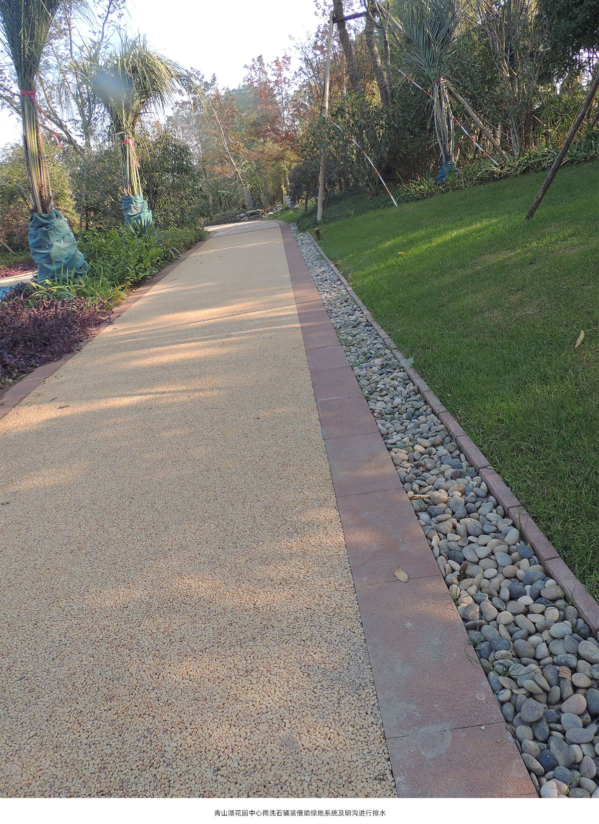 通過對鋪裝材料透氣性、生態性研究及鋪裝結構層施工工藝改進等措施,結合園林景觀地形處理、設置排水設施等手段,建立生態型鋪裝體系。